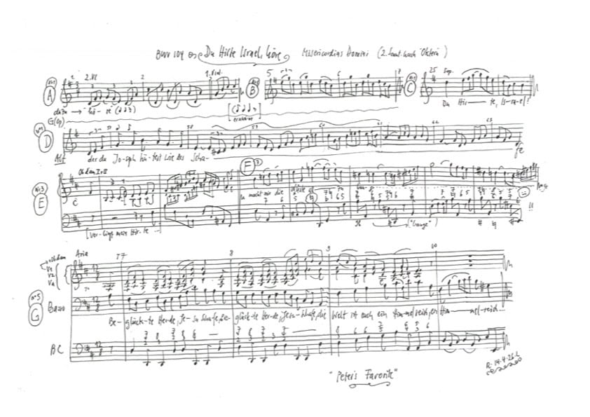 Der unbekannte Librettist hat Psalm 23 für den krönenden Schluss der Kantate vorgesehen und wählt deshalb für den Anfangschoral Worte aus Psalm 80, 2: «Du Hirte Israel, höre». Haltgebende Basstöne, wiegende Achtelgruppen und zutraulich getupfte «Schwer-Leicht»-Akzente sorgen im Orchester für eine Aura maximaler Geborgenheit, die die Seelen der Zuhörenden im ¾-Takt dahinschweben lässt. Die oft paarig angeordneten Singstimmen fügen sich diesem Gestus organisch ein, der dennoch Raum für elegant eingeführte Fugenpassagen («der du Joseph hütest wie der Schafe») lässt und auch drängender Erwartung eine Stimme verleiht («höre!», «erscheine!»).